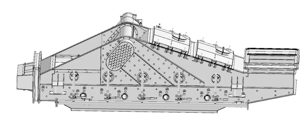 其中激振器為法蘭式激振器,安裝在篩體的篩幫上,可以減小設(shè)備高度,節(jié)約現(xiàn)場空間;篩體上安裝有密封蓋密封,進、出料口安裝有軟連接密封;可以實現(xiàn)全密封結(jié)構(gòu)設(shè)計。