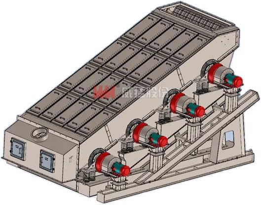 傳統(tǒng)振動(dòng)篩為整機(jī)振動(dòng),WFPS-G和傳統(tǒng)的振動(dòng)篩不同,它不整體參與振動(dòng),只有篩網(wǎng)和激振器總體參與振動(dòng)。