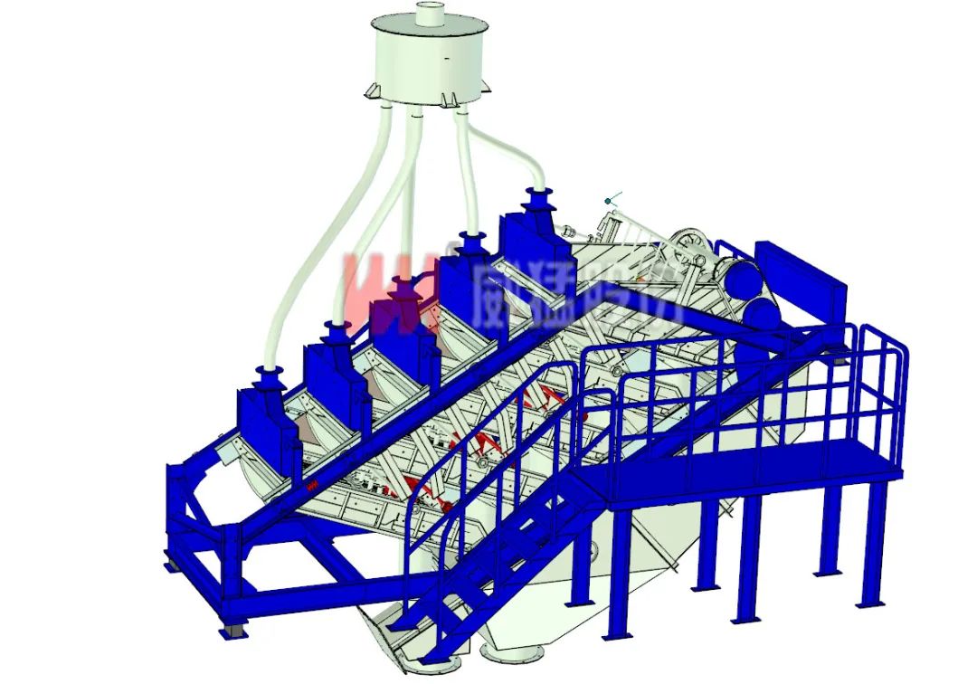 WFBS-D分布篩是威猛股份研發(fā)升級的新型篩分設(shè)備。其采用統(tǒng)一的振動源驅(qū)動多層篩箱共同振動且采用獨立篩分系統(tǒng)的篩箱上下錯落分層布置,各層篩面獨立完成給料、篩分作業(yè),各層篩面的篩下物、篩上物分別匯集排出。