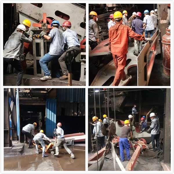 6月3日早上六點,客戶準(zhǔn)時停機,攻堅戰(zhàn)正式打響,根據(jù)施工計劃,清除1號篩底托混凝土,將底托先移出,誰知混凝土里面參雜有鋼筋,電鏟根本打不動,隨即改變方案,懸空篩體,移動底托,可由于空間位置受限,此方案再次否定。正值心急如焚時,帶隊人果斷決定,先移動篩體,從側(cè)面導(dǎo)出,通過四掛倒鏈斜拉移動。直至七點零五分才將篩體移出位,如果根據(jù)目前的速度,我們根本無法保證按期完工,時間相差甚遠。大家紛紛出主意想辦法,和用戶協(xié)商,請客戶叉車鏟車配合,可是進門的高度又不夠,叉車帶料過不去,最后只能讓客戶配合裝載機,通過鋼絲繩一點一點的挪動。到七點四十八分時,1號老篩子已經(jīng)全部倒運出來,但如果第二臺還用此方法,時間遠遠不夠,施工人員再次商議方案,將客戶的皮帶機支架割除,騰出空間位置。八點四十分時,已將2號老篩子、老料倉、篩體、底托等,放置到皮帶機下,暫時不倒運,為順利開機節(jié)省了大量的時間。又過了13分鐘,新設(shè)備1號篩子零部件開始倒運,由于進門口有坡度,叉車上不去,所有零部件通過液壓車人工倒運,一邊倒運一邊安裝,這樣的純?nèi)斯ぐ徇\,人員體力消耗非常大,進度緩慢。