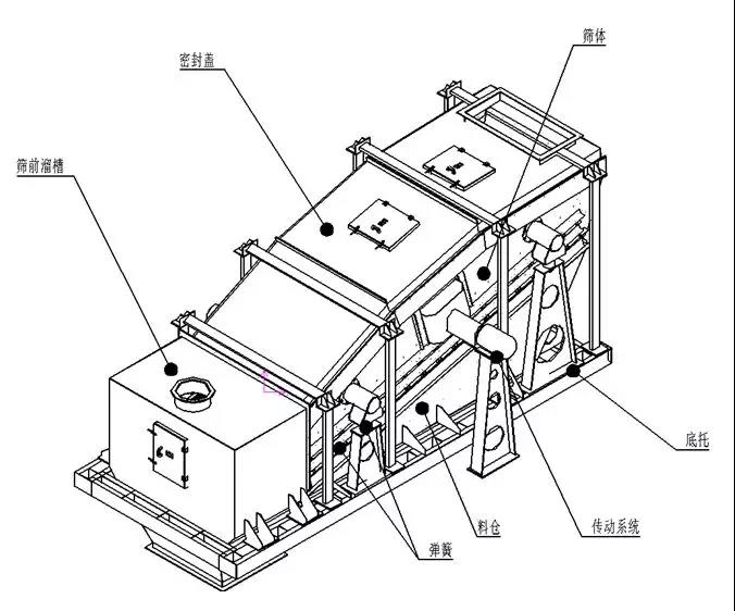 弛張篩是雙質量振動系統(tǒng),其中一個質體是篩箱,另一個質體是配重。在工作時,篩網(wǎng)交替地拉緊和松弛,使物料產生前進彈跳運動,可避免物料黏附篩網(wǎng)并堵塞篩孔。當兩質體相差二相位振動時,任意兩根相鄰橫梁時而靠近,時而遠離,彈性篩面也相應時而松弛,時而張緊。這種弛張運動不僅使篩孔不斷產生變形,而且大大增加了篩面的振動強度,從而有效地克服了篩孔堵塞現(xiàn)象,顯著提高了篩機處理能力。因此篩孔不但不易堵塞,而且篩分效率提高,處理量大,動負荷小,功耗少,噪聲低。