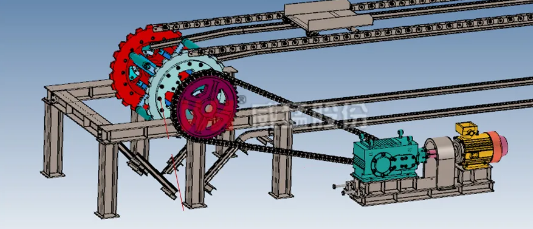 盤式多點(diǎn)卸料輸送機(jī)以板式套筒滾子鏈作為動力傳輸器件,鏈條與全部首尾相接的底部帶滾輪的臺車相連,并帶動臺車在設(shè)備所配的軌道上運(yùn)行。