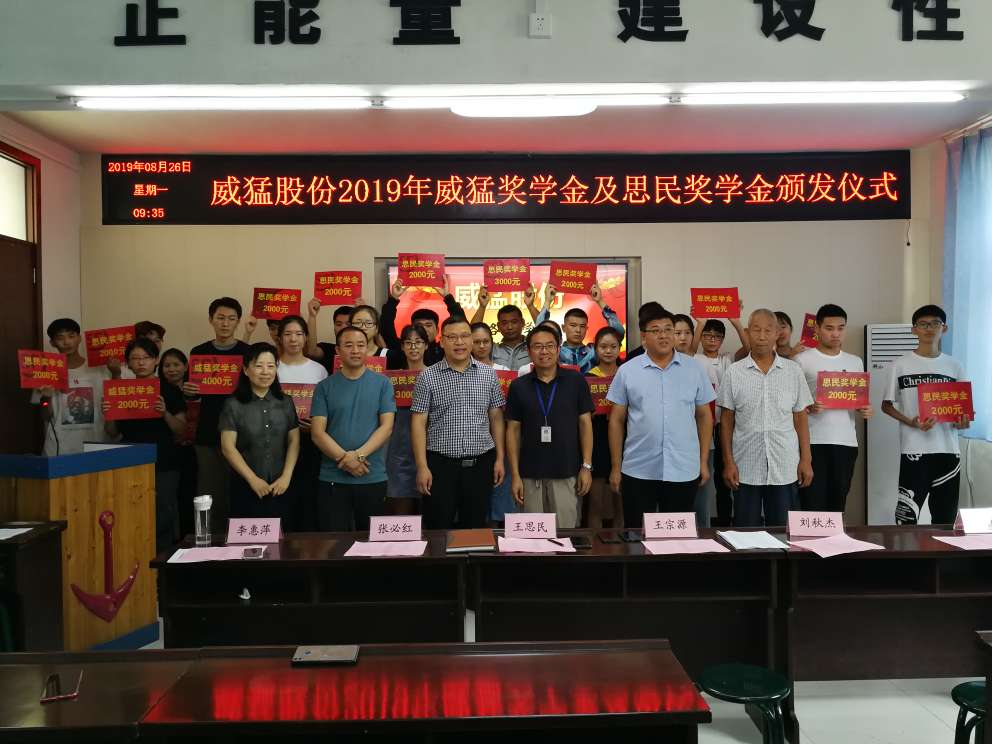 2019年8月26日上午,2019年度“威猛獎學(xué)金”和“思民獎學(xué)金”頒獎儀式在威猛學(xué)院隆重舉行。參加此次儀式的有翟坡鎮(zhèn)鎮(zhèn)長王宗源、威猛股份總經(jīng)理王思民、威猛股份行政部經(jīng)理張必紅、南東村、南西村、寺王村